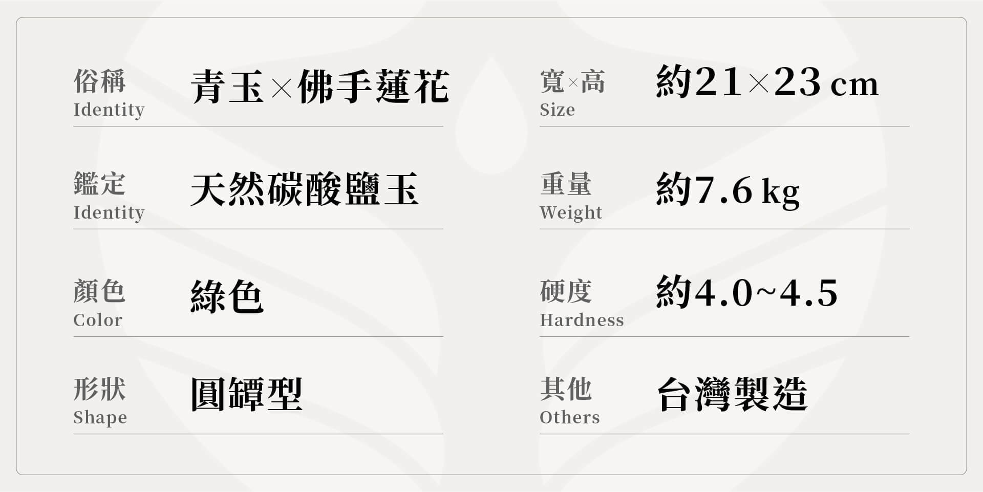 形狀:圓罈型/重量:約7.6kg/寬高:21x21x23 cm/硬度:約4.0~4.5/加工地:台灣