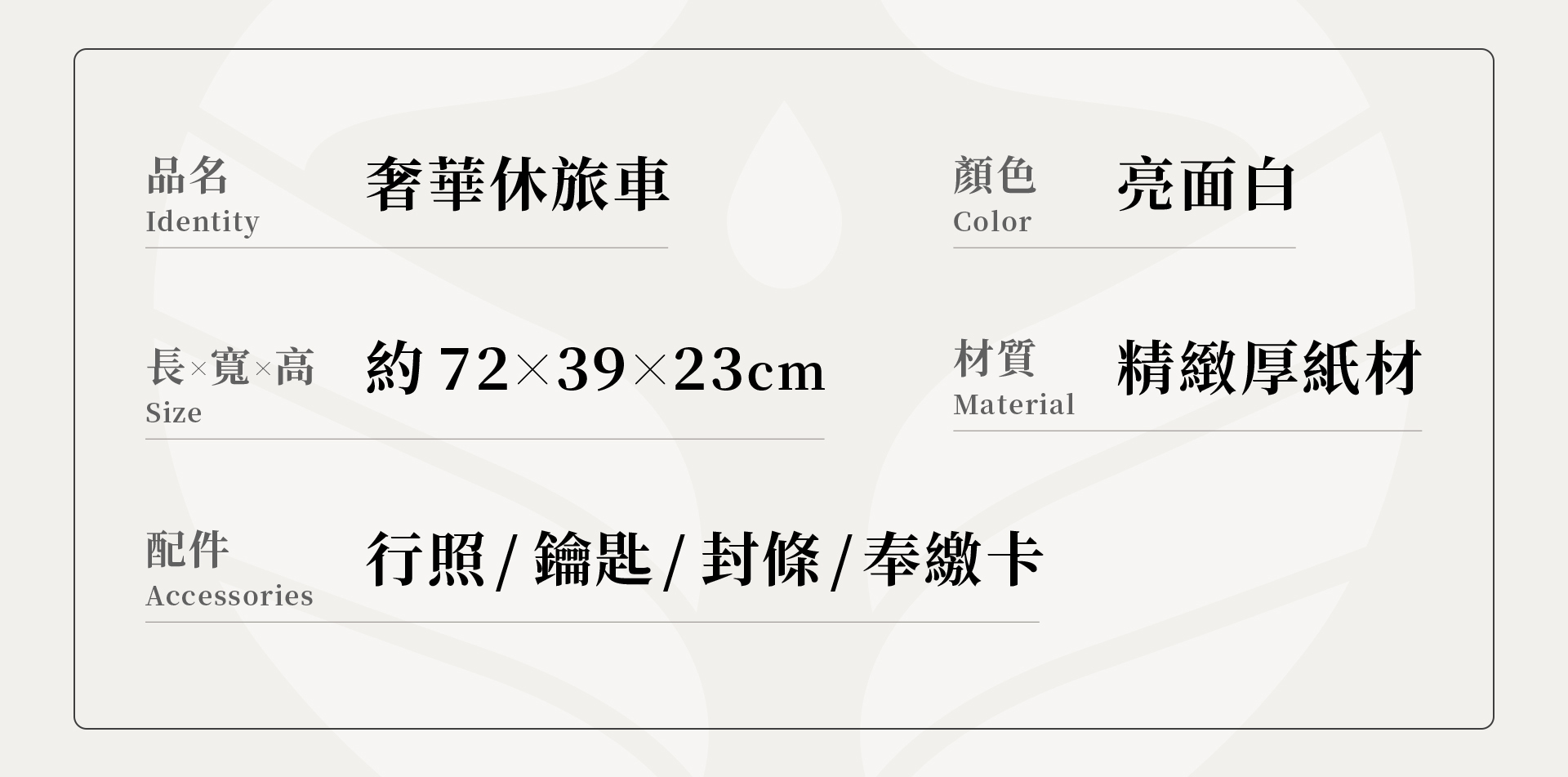 材質:精緻厚紙材 / 長寬高:72 x 39 x 23cm 配件:行照、鑰匙、封條、奉繳卡