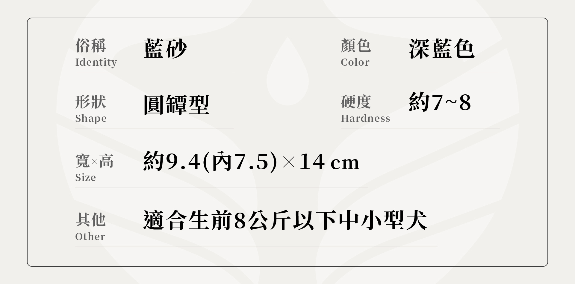 形狀:圓罈型/寬高:9.4(內7.5) x 14 cm/硬度:約7~8/加工地:台灣