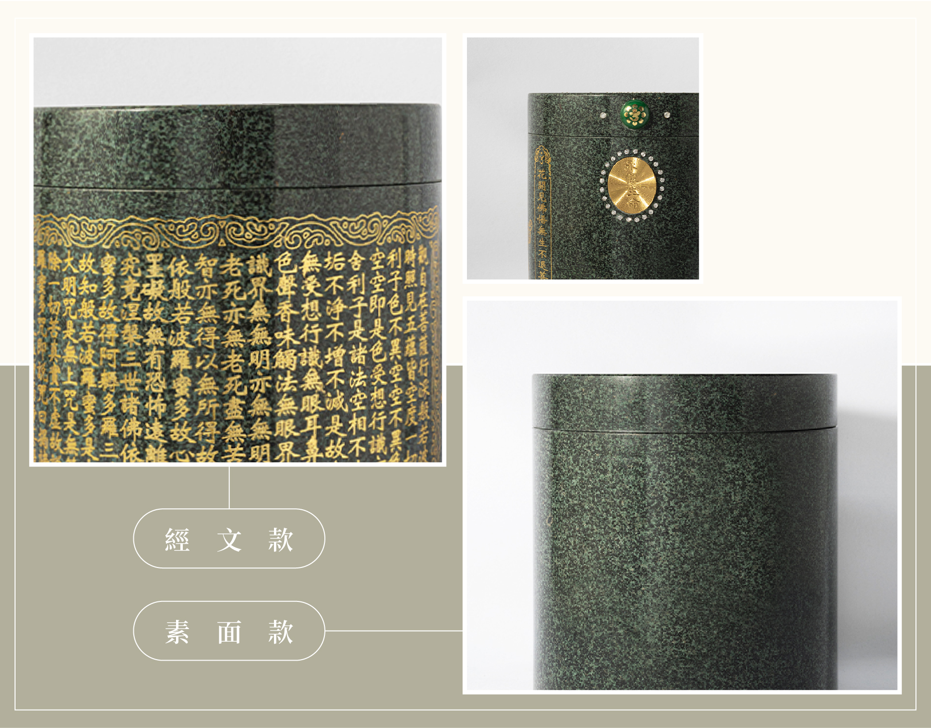 分為素面款式以及經文款式,經文款式銘刻般若波羅蜜多心經,為佛教教義精要。