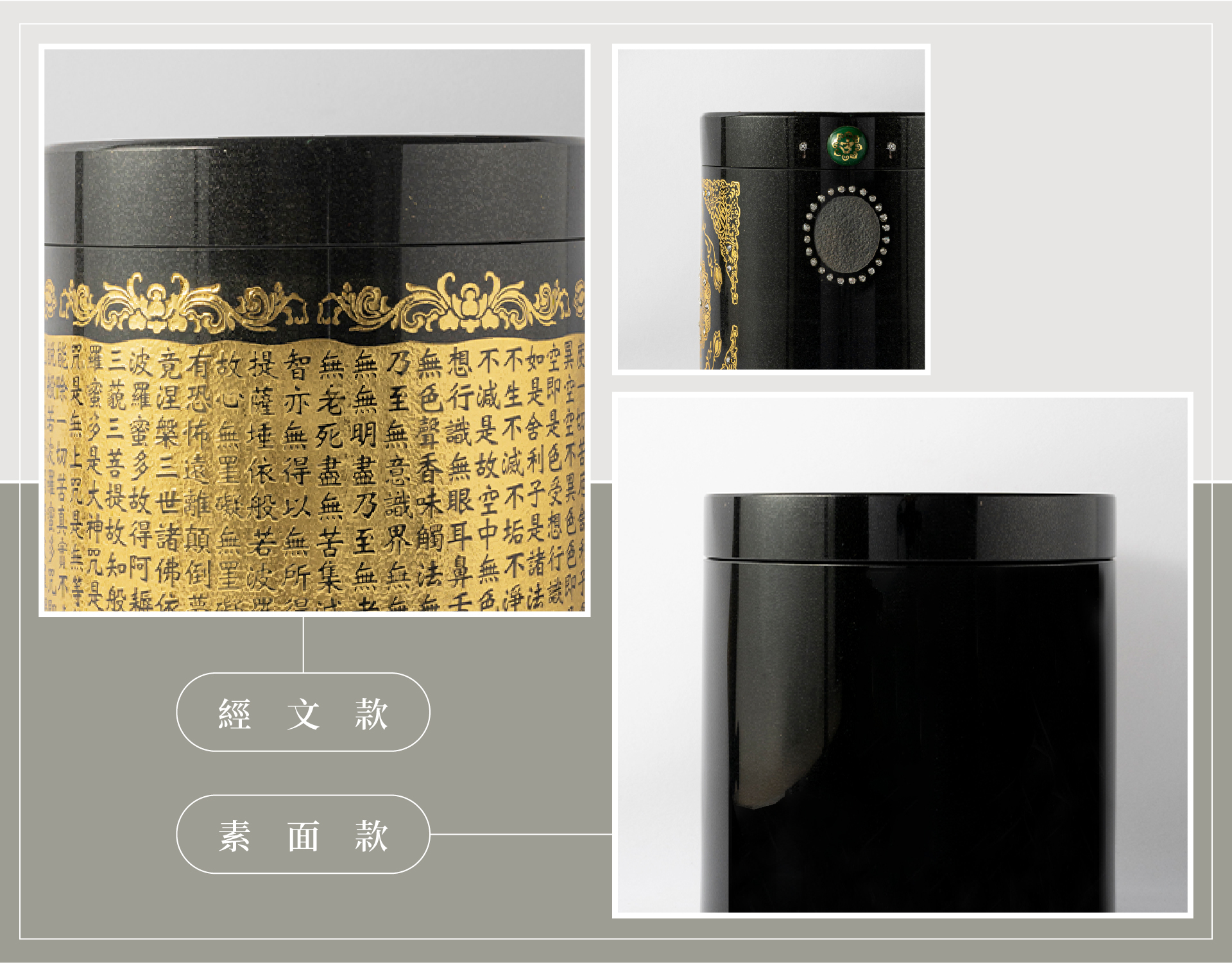分為素面款式以及經文款式,經文款式銘刻般若波羅蜜多心經,為佛教教義精要。