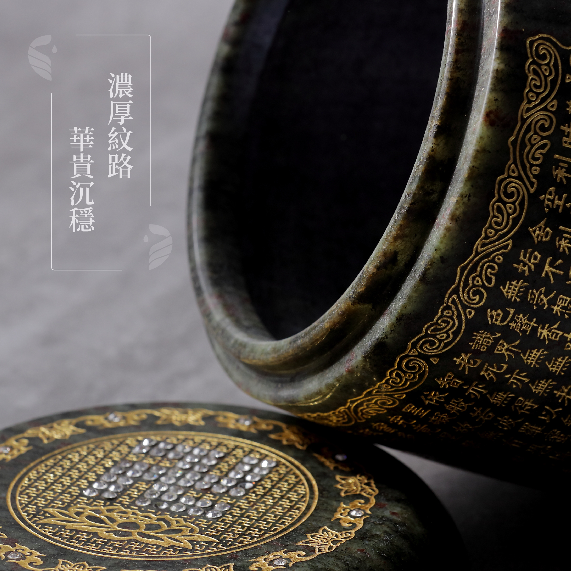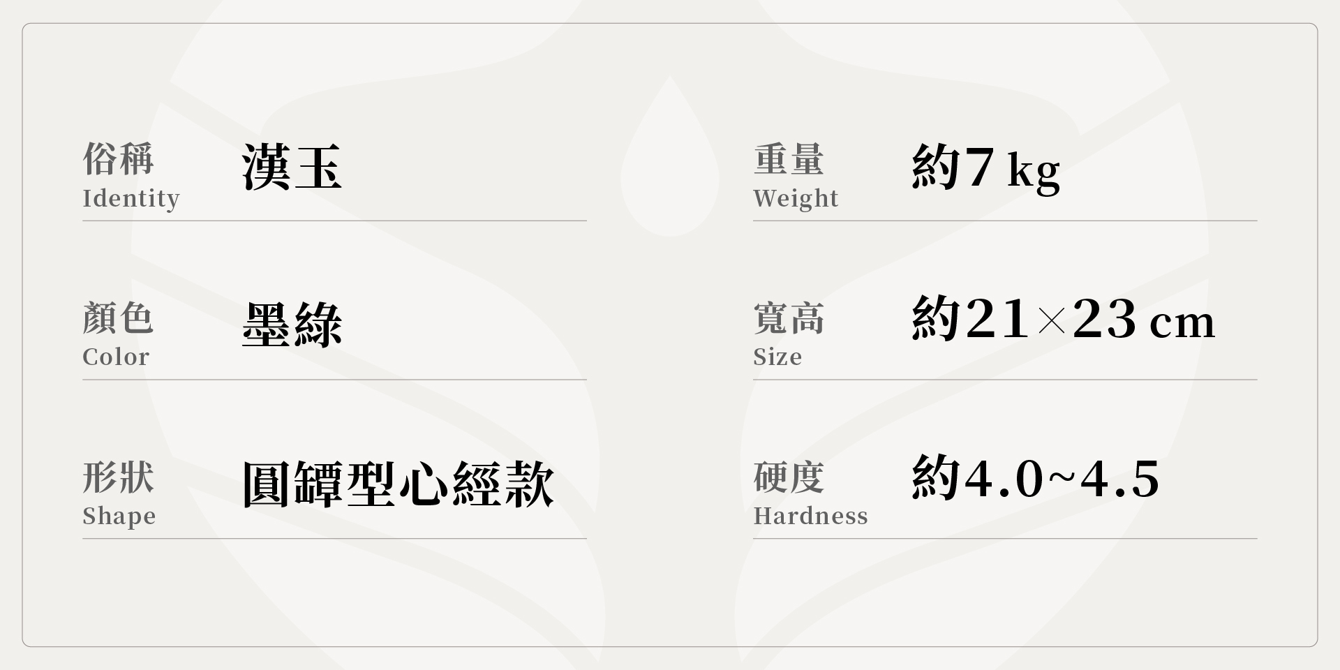 俗稱:漢玉/顏色:墨綠色/形狀:圓罈型/重量:約7kg/寬高:21x21x23 cm/硬度:約4.0~4.5/加工地:台灣