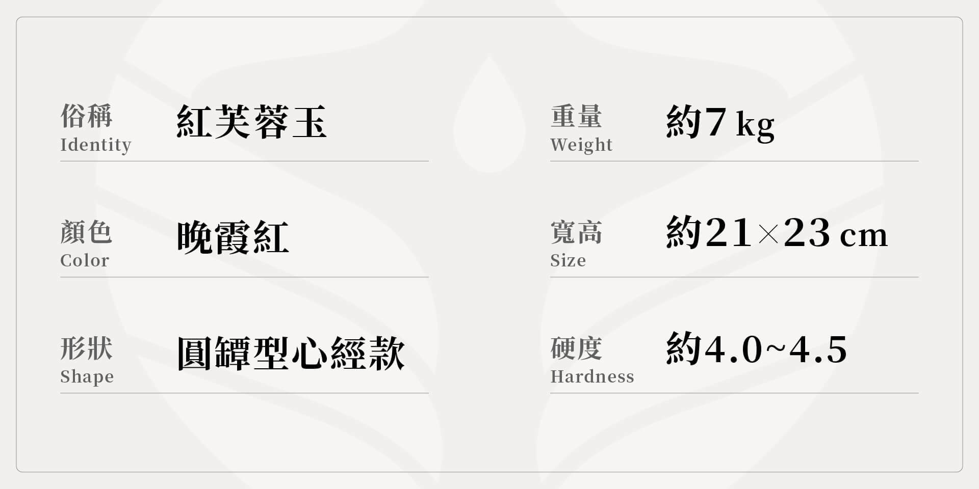 俗稱:紅芙蓉玉/顏色:晚霞紅/形狀:圓罈型心經款/重量:約7 kg/寬高:21x21x23 cm/硬度:約4.0~4.5/加工地:台灣