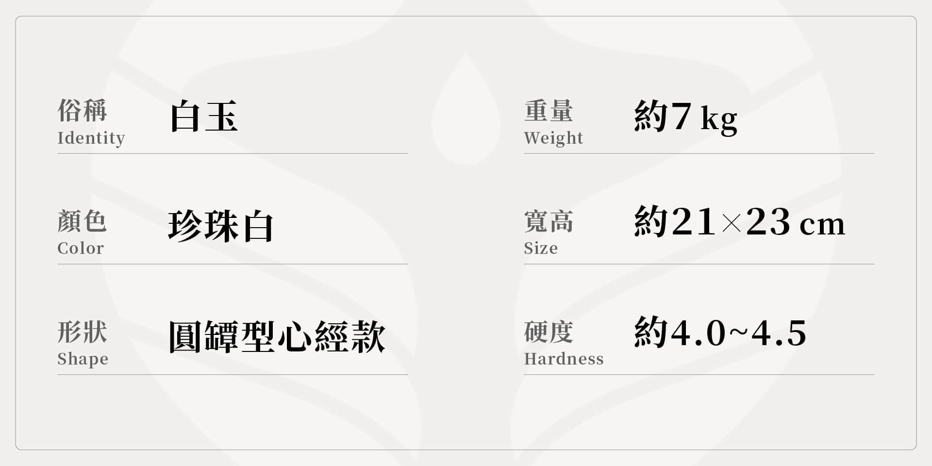 俗稱:白玉/顏色:珍珠白/形狀:圓罈型/重量:約7 kg/寬高:21x21x23 cm/硬度:約4.0~4.5/加工地:台灣